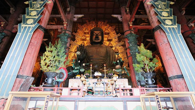 Todai-ji is Japan’s most impressive Buddhist temple complex and a UNESCO World Heritage Site. The Great Buddha Hall (Daibutsuden) is the world’s largest wooden building, housing a 15-meter bronze Buddha (Daibutsu) cast in 752 AD — one of Japan’s greatest artistic achievements. A famous wooden pillar inside the hall has a small square hole at its base — legend says that those who can squeeze through it will be granted enlightenment (a popular activity for children and adventurous adults). Admission is ¥600 for adults.